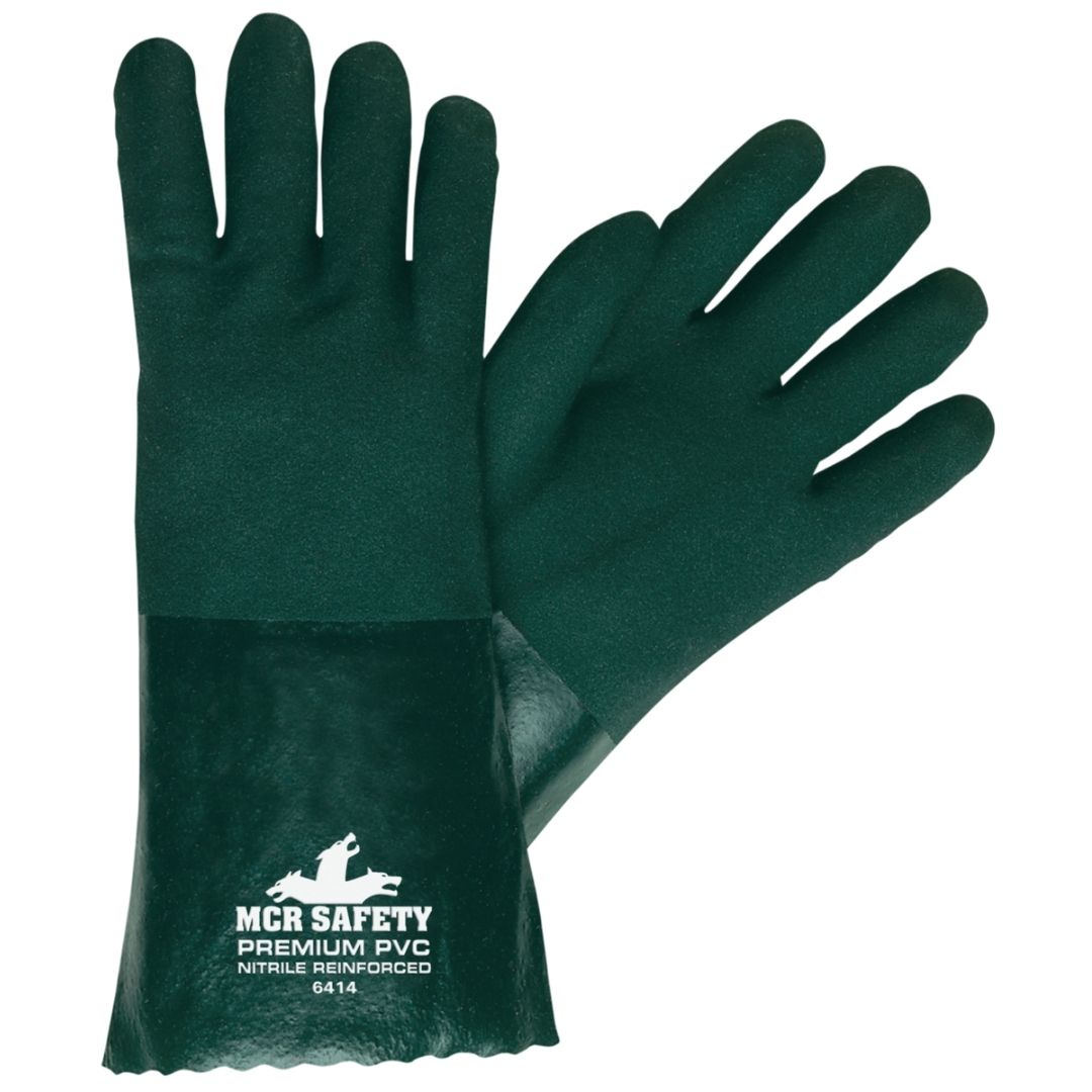 Estos guantes de PVC MCR Safety Premium están diseñados para aguantar en aplicaciones petroquímicas. Consisten en dos capas de PVC verde con textura arenosa reforzado con nitrilo para proporcionar tenacidad y resistencia a la abrasión. Esta serie premium ofrece longitudes de guantes que van de 10 a 18 pulgadas. El modelo 6414 tiene 14 pulgadas de largo, se sumerge doble en PVC verde, y tiene un acabado arenoso para mayor agarre. También está forrado con cómodo algodón tipo jersey y tratado con ActiFresh® para ayudar a prevenir los olores y eliminar las bacterias.